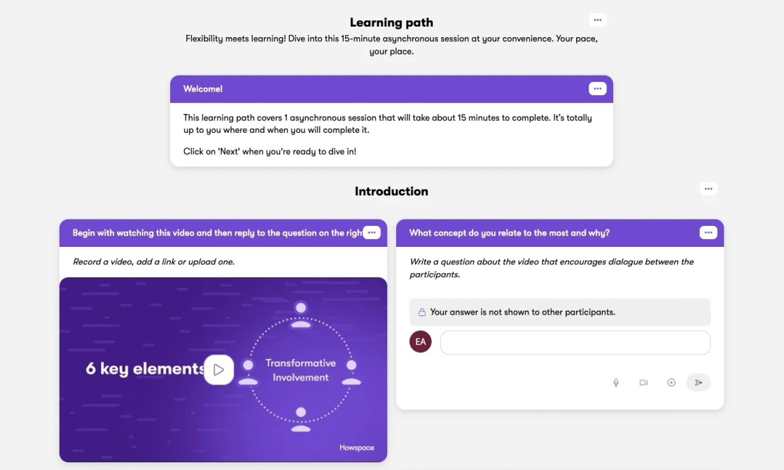 This template showcases the use of the Learning Path feature in Howspace. You can use it in multiple ways, but it's at its best when you want to offer information and tasks to your participants in bite-size bits when working asychronously.